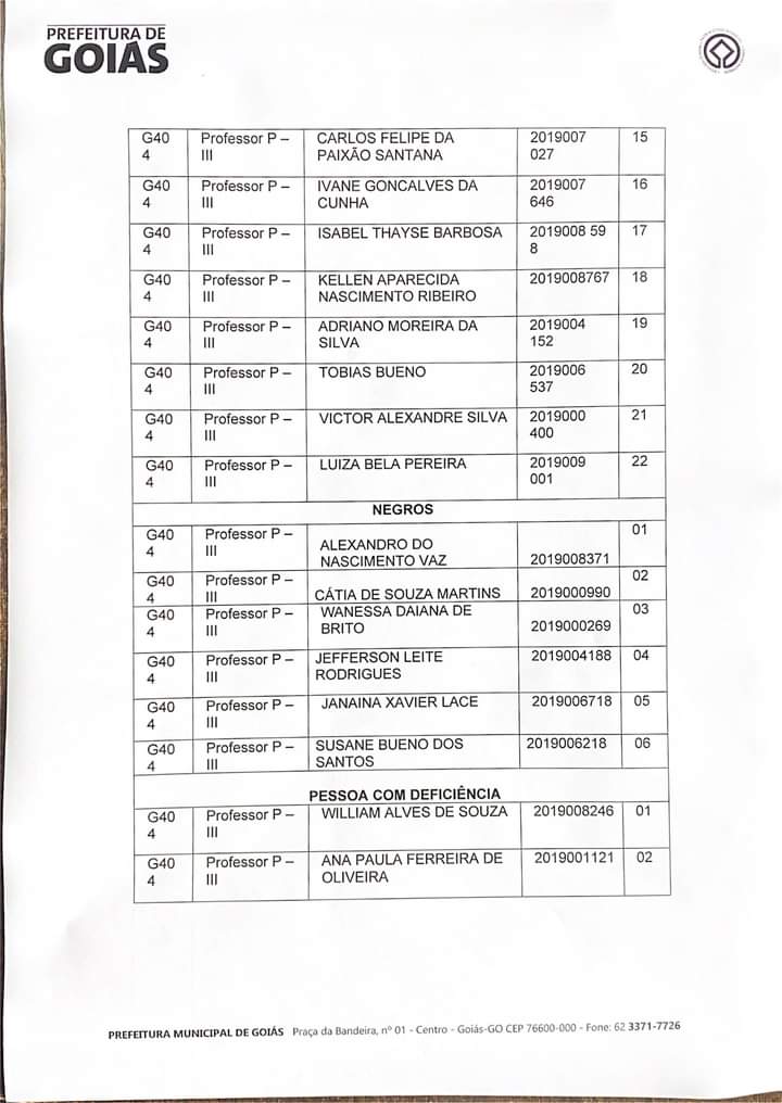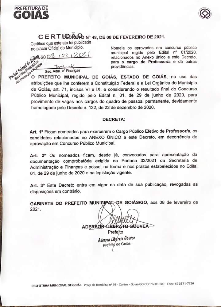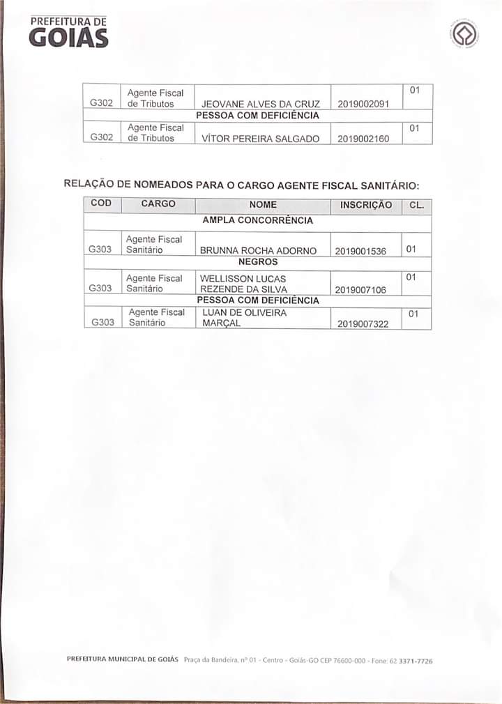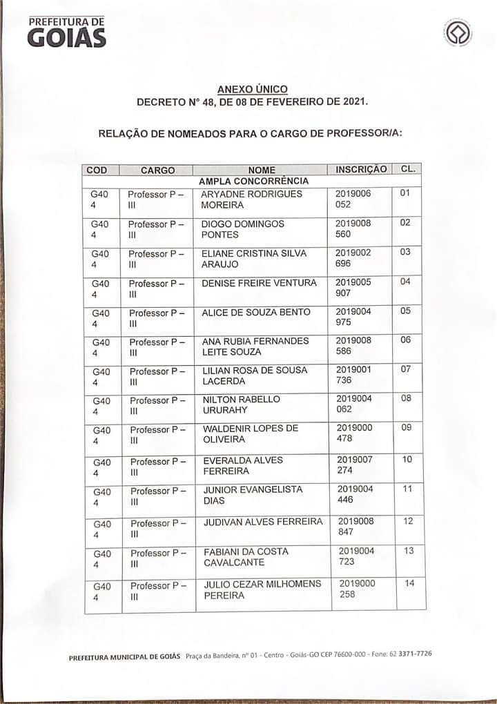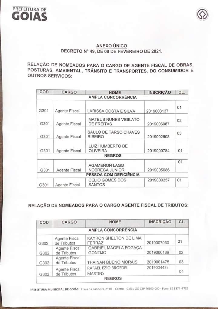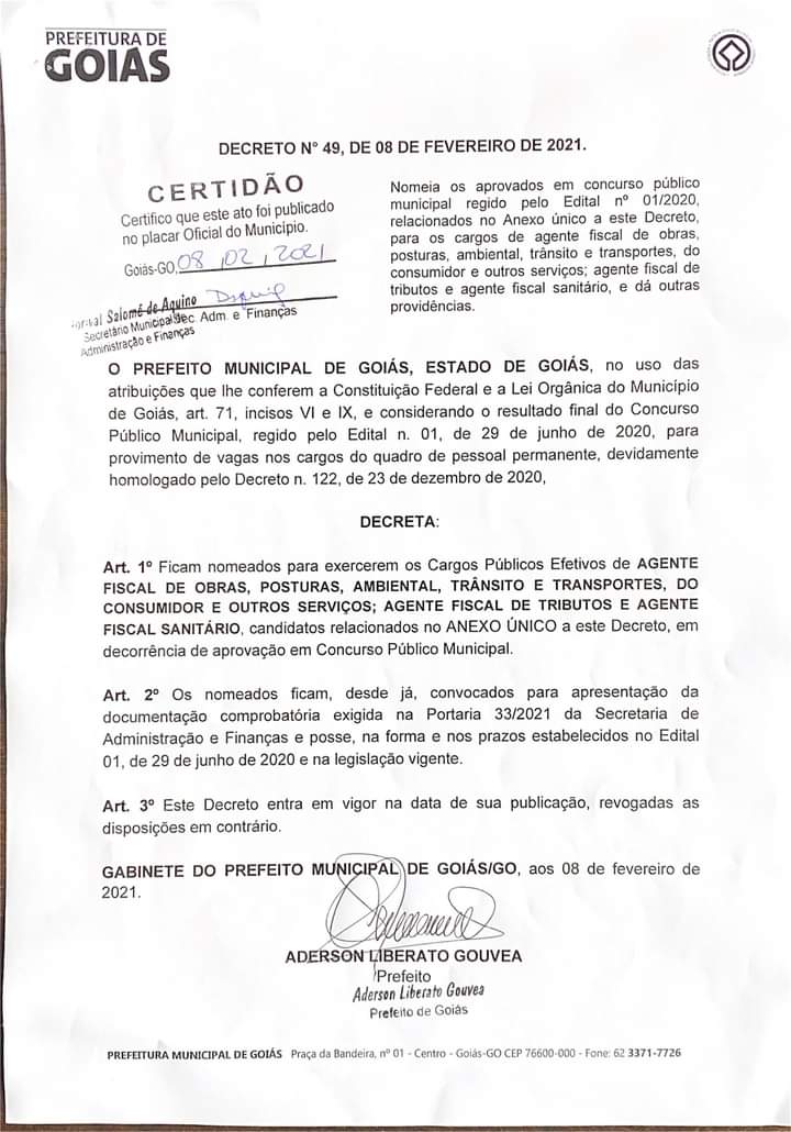O concurso público municipal foi realizado na gestão anterior, no dia 27 de setembro de 2020 na Cidade de Goiás.