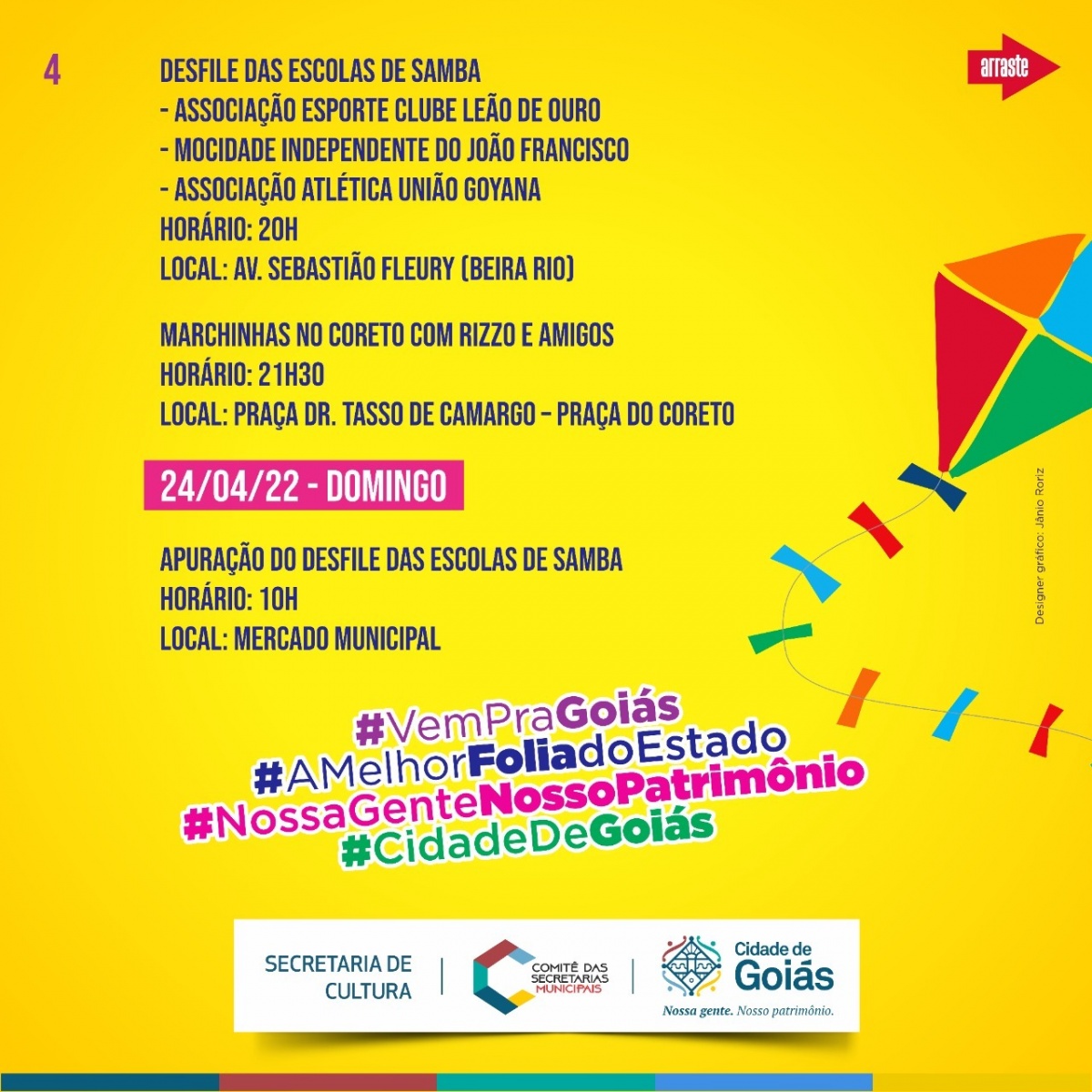 🪁 A Prefeitura de Goiás, por meio da Secretaria Municipal de Cultura e o apoio do Comitê das Secretarias Municipais, realiza a Folia de Abril, com o tema “Vai Passar” em alusão ao fim esperado do contágio do vírus, teremos festividades do dia 21 ao dia 24 de abril.